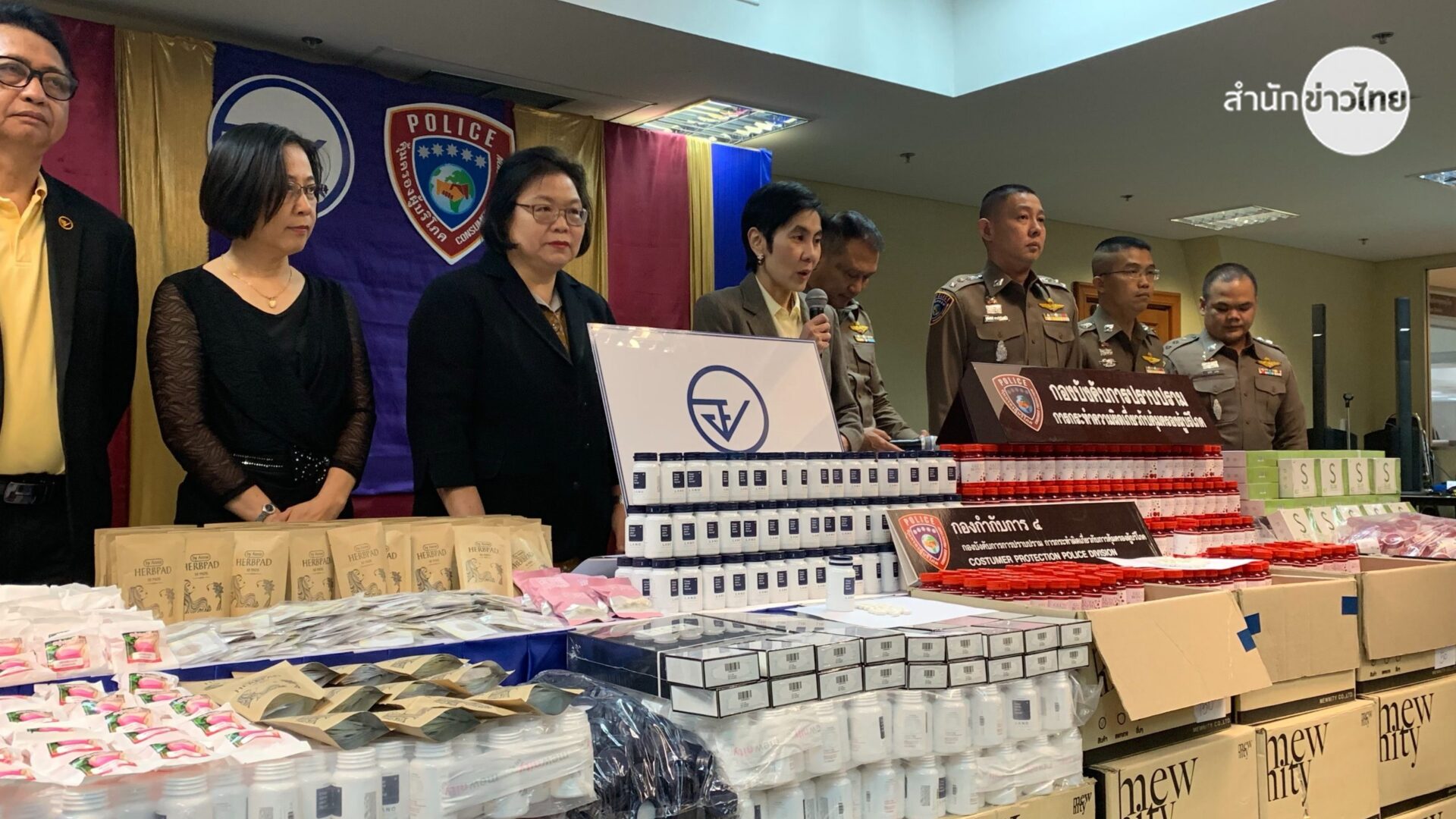 นอกจากนี้ ยังจับกุมผลิตภัณฑ์ที่โฆษณาเกินจริง ก่อให้เกิดความเข้าใจผิด ทาง facebook คือ แผ่นแปะสะดือ เผาผลาญไขมัน 12,000 แผ่น และสบู่นมเด้ง ตึงจนผัวทัก 130 ก้อน รวมมูลค่ากว่า 1,200,000 บาท จากบ้านเลขที่ 22/65 ม.2 อ.สามโคก จ.ปทุมธานี ดำเนินคดีในข้อหา ไม่จดทะเบียน สถานประกอบการนำเข้า เครื่องมือแพทย์ และ ผลิตเครื่องสำอางปลอม ระวางโทษจำคุกสูงสุดไม่เกิน 1 ปี หรือ ปรับไม่เกิน 100,000 บาท หรือทั้งจำทั้งปรับ.-สำนักข่าวไทย