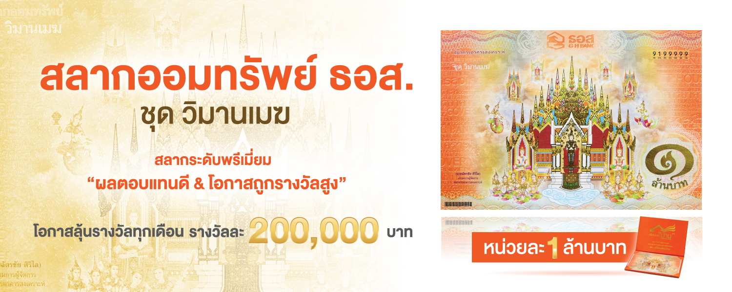 ทั้งนี้ สลากออมทรัพย์ ธอส. แบบพรีเมียม ชุดวิมานเมฆ ราคาจำหน่ายหน่วยละ 1 ล้านบาท จำนวน 27,000 หน่วย หรือ 27,000 ล้านบาท อายุสลาก 3 ปี ผลตอบแทนเมื่อฝากครบ 3 ปี จะได้รับเงินต้นพร้อมดอกเบี้ยหน่วยละ 42,000 บาท หรือคิดเป็น 1.4% ต่อปี ได้ลุ้นรางวัลทุกวันที่ 16 ของเดือน รางวัลละ 200,000 บาท จำนวน 27 รางวัล/เดือน หรือตลอด 3 ปีจะได้ลุ้นรางวัลถึง 36 ครั้ง รวม 972 รางวัล หากถูกรางวัล 1 ครั้ง ผลตอบแทนเฉลี่ยจะอยู่ที่ 8.07% ต่อปี ถูกรางวัล 3 ครั้ง ผลตอบแทนเฉลี่ย 21.40% ต่อปี หรือถูกรางวัล 5 ครั้ง ผลตอบแทนเฉลี่ยจะสูงถึง 24.73% ต่อปี และเมื่อครบ 3 ปี ยังสามารถเลือกที่จะถือสลากต่อเพื่อรับผลตอบแทนตามที่ธนาคารกำหนดหรือมอบเป็นมรดกตกทอดให้แก่ลูกหลานได้ สอบถามรายละเอียดเพิ่มเติมได้ที่ ธอส. ทุกสาขาทั่วประเทศ หรือ ศูนย์ลูกค้าสัมพันธ์ โทร.0-2645-9000 หรือ www.ghbank.co.th และ Facebook Fanpage ธนาคารอาคารสงเคราะห์ . – สำนักข่าวไทย