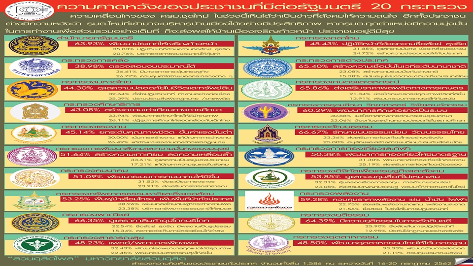 ความเคลื่อนไหวของ ครม.ชุดใหม่ในช่วงนี้เห็นได้ว่าเป็นข่าวที่สังคมให้ความสนใจ อีกทั้งประชาชนต่างมีความหวังว่า รมต.ใหม่ที่เข้ามาจะบริหารบ้านเมืองได้อย่างมีประสิทธิภาพ หากรมต.ทุกตำแหน่งมีความมุ่งมั่นในการทำงานเพื่อส่วนรวมอย่างเต็มที่ ก็จะส่งผลให้บ้านเมืองเจริญก้าวหน้า ประชาชนอยู่ดีมีสุข เพื่อสะท้อนความคิดเห็นของประชาชนที่สนใจติดตามข่าวการเมือง “สวนดุสิตโพล” มหาวิทยาลัยสวนดุสิต จึงได้สำรวจความคิดเห็นของประชาชนทั่วประเทศ กรณี เรื่องที่ประชาชนคาดหวังต่อรัฐมนตรี 20 กระทรวง จำนวนทั้งสิ้น 1,586 คน ระหว่างวันที่ 16-20 กรกฎาคม 2562 สรุปผลได้ ดังนี้
