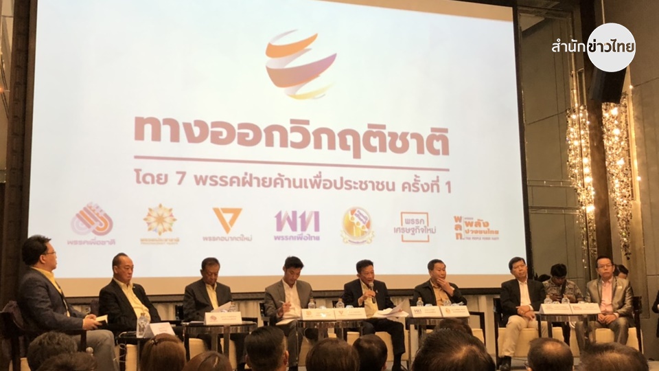ผู้สื่อข่าวรายงานว่า ที่โรงแรมแลงคาสเตอร์ 7 พรรคฝ่ายค้านเพื่อประชาชน ประกอบด้วย พรรคเพื่อไทย พรรคอนาคตใหม่ พรรคประชาชาติ พรรคเศรษฐกิจใหม่ พรรคเสรีรวมไทย พรรคพลังปวงชนไทย และพรรคเพื่อชาติ จัดเสวนาหัวข้อ “ทางออกในการแก้ไขปัญหาวิกฤตของชาติ” โดยมีนายสมพงษ์ อมรวิวัฒน์ หัวหน้าพรรคเพื่อไทย นายธนาธร จึงรุ่งเรืองกิจ หัวหน้าพรรคอนาคตใหม่ พล.ต.อ.เสรีพิศุทธ์ เตมียเวส หัวหน้าพรรคเสรีรวมไทย นายวัน มูหะมัดนอร์ มะทา หัวหน้าพรรคประชาชาติ นพ.นิยม วิวรรธนดิษฐกุล รองหัวหน้าพรรคเศรษฐกิจใหม่ นายสงคราม กิจเลิศไพโรจน์ หัวหน้าพรรคเพื่อชาติ และนายนิคม บุญวิเศษ หัวหน้าพรรคพลังปวงชนไทย ร่วมเป็นวิทยากร