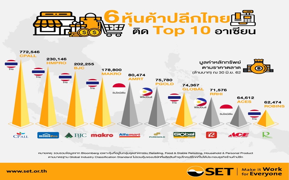กรุงเทพฯ 22 ก.ค. – ตลท.เผย 6 หุ้นค้าปลีกไทยติดท็อป 10 ในอาเซียน ด้วยมูลค่าหลักทรัพย์ตามราคาตลาดสูงที่สุด CPALL รั้งที่ 1