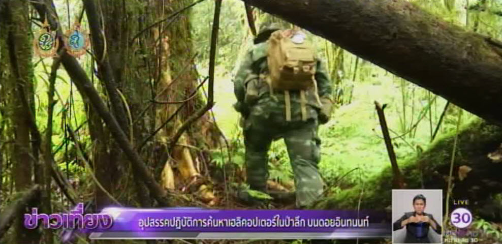 เราติดตามเจ้าหน้าที่เดินเข้าไปในป่าระยะหนึ่ง ซึ่งเต็มไปด้วยความยากลำบาก เนื่องจากเต็มไปด้วยต้นไม้ในหน้าฝน และฝนที่ตกลงมาอย่างต่อเนื่อง ทำให้พื้นซึ่งเต็มไปด้วยเศษไม้และใบหญ้าชื้นแฉะ บางช่วงกลายเป็นโคลน ทำให้เดินอย่างยากลำบาก ยังไม่รวมถึงหมอกที่ปกคลุมหนาเกือบตลอดทั้งวัน จนแทบมองไม่เห็นทางข้างหน้า เราเดินตามเจ้าหน้าที่ไปได้ไม่กี่ร้อยเมตร ซึ่งเป็นไปตามข้อตกลงในการทำงานร่วมกับเจ้าหน้าที่ แต่ก็สัมผัสได้ถึงความยากลำบากในการค้นหาเฮลิคอปเตอร์กลางป่าลึกในครั้งนี้ ซึ่งเจ้าหน้าที่แต่ละนายต้องใช้ความระมัดระวังและความพยายามอย่างมาก ในการปูพรมค้นหาในบริเวณ 12 ตร.กม.ที่กำหนด. – สำนักข่าวไทย