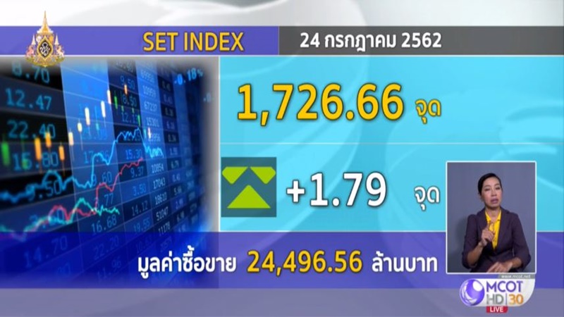 กทม .24 ก.ค.-ดัชนีเช้านี้ปรับขึ้นตามภูมิภาค หลังสหรัฐ-จีนเตรียมเจรจาการค้าสัปดาห์หน้า พร้อมเล็งธนาคารกลางยุโรปผ่อนคลายนโยบายการเงินในวันพรุ่งนี้ โดยดัชนีช่วงเที่ยงปิดบวก 1.79 จุด ที่ระดับ 1,726.66 จุด มูลค่าการซื้อขาย 24,496.56 ล้านบาท .-สำนักข่าวไทย