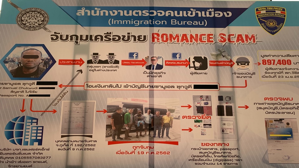พลตำรวจโทสมพงษ์ ชิงดวง รักษาราชการผู้บัญชาการสำนักงานตรงจคนเข้าเมือง แถลงผลการจับกุม นายซามูเอล อายุ 38 ปี สัญชาติไนจีเรีย พร้อม ของกลาง สมุดบัญชีธนาคาร บัตรเอทีเอ็ม โทรศัพท์มือถือ และเอกสารการโอนเงิน รวม 14 รายการ ซึ่งผู้ต้องหาเป็นหนึ่งในแก๊งโรแมนซ์สแกม หรือ ลวงรัก ออนไลน์ ตามหมายจับศาลจังหวัดภูเก็ตในข้อหา ร่วมกันฉ้อโกงโดยการแสดงตนเป็นผู้อื่น ซึ่งไปสวมรอยเป็นชาวต่างชาติคนอื่น แล้วไปสานสัมพันธ์พูดคุยกับหญิงไทยในโลกโซเชี่ยล โดยใช้เฟสบุ๊กเป็นเครื่องมือ อ้างตัวเป็นนักธุกิจและนายหน้าค้าที่ดิน หน้าตาดี โปรไฟล์เยี่ยม เข้าไปทักทายสนทนากับเหยื่อหญิงชาวไทย หลอกลวงว่ามีเพื่อนเป็นนักธุรกิจต้องการซื้อบ้านจัดสรรและที่ดินราคา 160 ล้านบาท แต่ต้องเสียค่าธรรมเนียมดำเนินการเป็นเงิน 897,400 บาท จึงลวงให้เหยื่อหลงเชื่อโอนเงินจ่ายค่าธรรมเนียมให้ก่อน ภายหลังเมื่อทราบว่าถูกหลอก ผู้เสียหายได้ไปแจ้งความไว้ที่ สภ.วิชิต จังหวัดภูเก็ต จนศาลจังหวัดภูเก็ตอนุมัติหมายตับในเวลาต่อมา