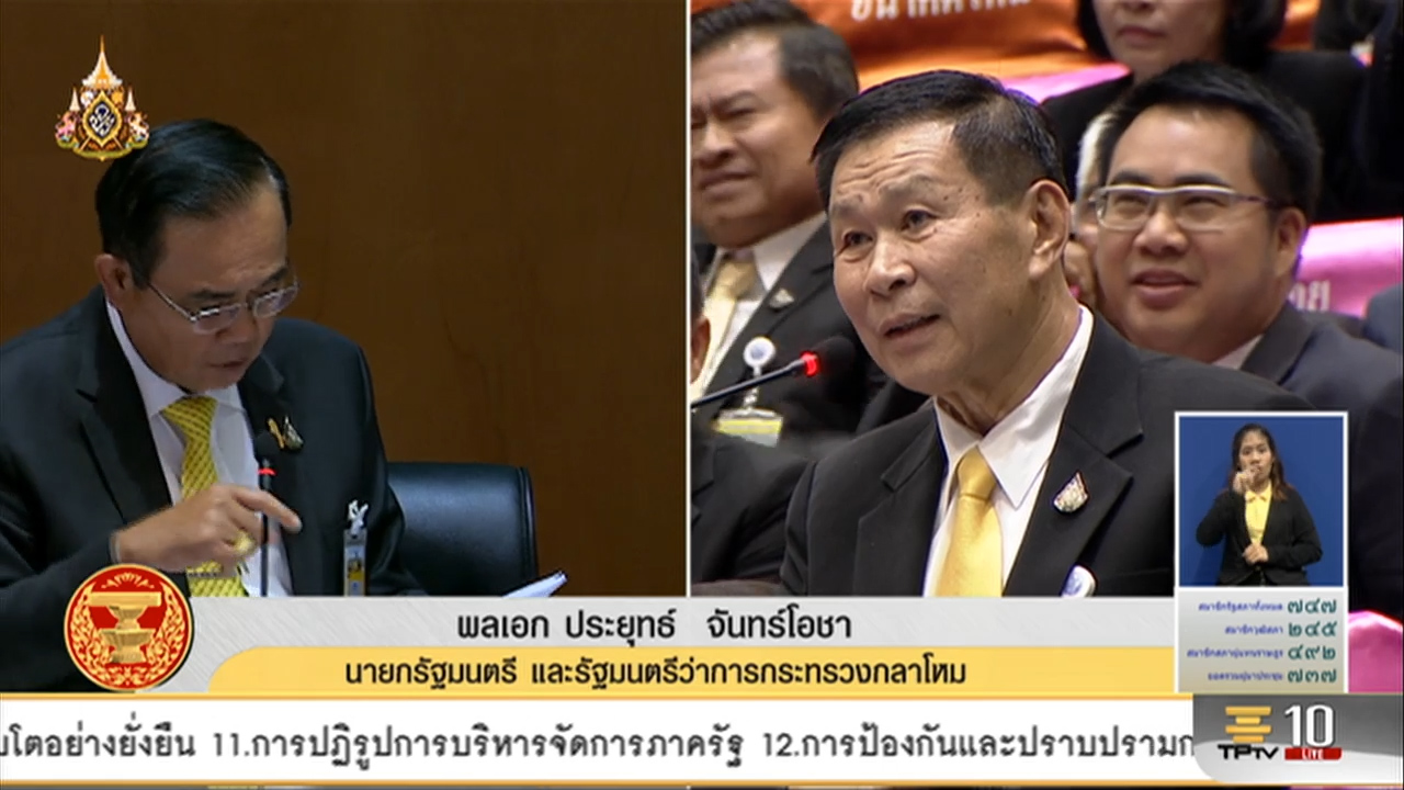 ในช่วงค่ำของการแถลงนโยบายรัฐบาลต่อรัฐสภา พลตำรวจเอกเสรีพิศุทธ์ เตมียเวส หัวหน้าพรรคเสรีรวมไทย และ ส.ส.บัญชีรายชื่อ ขึ้นอภิปรายเปิดด้วยการถามพลเอกประวิตร วงษ์สุวรรณ รองนายกรัฐมนตรี ว่าวันนี้สื่อมวลชนมาเยอะ เก็บนาฬิกาที่ยืมเพื่อนมาไปหรือยัง ก่อนจะกล่าวว่า ตนเองลงพื้นที่บ่อย ประชาชนก็บอกว่า นายกรัฐมนตรีไม่สง่างามเลยเลือกตั้งครั้งแรกก็ปล้นมา ครั้งที่ 2 ก็โกงการเลือกตั้ง แต่ตนเองไม่เชื่อ เพราะเป็นนักเรียนเตรียมทหารเช่นเดียวกับ นายกรัฐมนตรี ซึ่งสถาบันเหล่านี้ สอนให้ซื่อสัตย์ สุจริต ปฏิบัติหน้าที่เพื่อประชาชน และเป็นทหารต้องกระทำพิธีต่อธงชัยเฉลิมพลในวันกองทัพไทยด้วย คงไม่ทำเรื่องเช่นนี้ แต่ชาวบ้านอธิบายให้ฟังว่า นายกรัฐมนตรีเข้ามาเป็นรัฐบาลด้วยการยึดอำนาจ ซึ่งถือเป็นกบฏ เพียงแต่ได้รับการอภัยโทษและได้กล่าวอ้างตลอดเวลาว่าต้องเข้ามายึดอำนาจ เพราะบ้านเมืองไม่สงบเรียบร้อย แต่ในข้อเท็จจริงไม่ได้เป็นเช่นนั้น แต่ต้องการที่จะเอาอำนาจ แต่งตั้งองค์กรอิสระเพื่อช่วยเหลือกัน