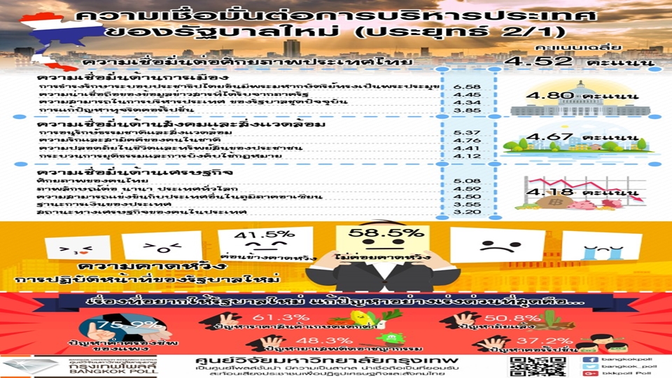 กรุงเทพโพล โดยศูนย์วิจัยมหาวิทยาลัยกรุงเทพ สำรวจความคิดเห็นประชาชน เรื่อง “ความเชื่อมั่นต่อการบริหารประเทศของรัฐบาลใหม่ (ประยุทธ์2/1)” โดยเก็บข้อมูลกับประชาชนจากทุกภูมิภาคทั่วประเทศจำนวน 1,176 คน พบว่าประชาชนมีความเชื่อมั่นต่อการบริหารประเทศของรัฐบาลใหม่ เฉลี่ยในภาพรวม 4.52 คะแนน จากคะแนนเต็ม 10 คะแนน โดยมีความเชื่อมั่นด้านการเมืองมากที่สุด 4.80 คะแนน รองลงมาคือด้านสังคมและสิ่งแวดล้อม 4.67 คะแนน และด้านเศรษฐกิจ 4.18 คะแนน เมื่อแยกพิจารณาในแต่ละด้านพบว่า ตัวชี้วัดด้านการเมืองที่ประชาชนให้คะแนนความเชื่อมั่นมากที่สุดคือ ด้านการธำรงรักษาระบอบประชาธิปไตยอันมีพระมหากษัตริย์ทรงเป็นพระประมุข 6.58 คะแนน ส่วนตัวชี้วัด ด้านสังคมและสิ่งแวดล้อมที่ประชาชนให้คะแนนความเชื่อมั่นมากที่สุดคือ ด้านการอนุรักษ์ธรรมชาติและสิ่งแวดล้อม 5.37 คะแนน และตัวชี้วัดด้านเศรษฐกิจที่ประชาชนให้คะแนนความเชื่อมั่นมากที่สุดคือด้านศักยภาพของคนไทย 5.08 คะแนน