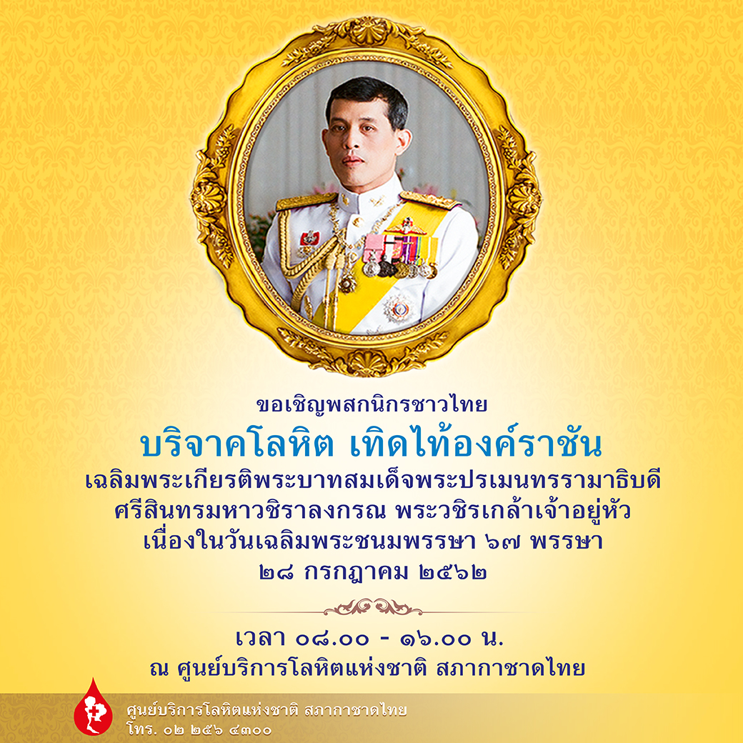 สภากาชาดไทย 28 ก.ค.- เชิญชวนพสกนิกรบริจาคโลหิต เทิดไท้องค์ราชัน เฉลิมพระเกียรติพระบาทสมเด็จพระปรเมนทรรามาธิบดีศรีสินทรมหาวชิราลงกรณ พระวชิรเกล้าเจ้าอยู่หัว เนื่องในวันเฉลิมพระชนมพรรษา 67 พรรษา 28 กรกฎาคม 2562 ตั้งแต่เวลา 08.00 – 16.00 น. และร่วมลงนามถวายพระพร ตลอดเดือนกรกฎาคม 2562 ณ ศูนย์บริการโลหิตแห่งชาติ ถนนอังรีดูนังต์