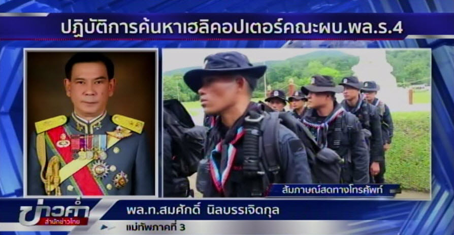 กรุงเทพฯ 14 ส.ค. – พล.ท.สมศักดิ์ นิลบรรเจิดกุล แม่ทัพภาคที่ 3 กล่าวถึงความคืบหน้าการค้นหาเฮลิคอปเตอร์ รุ่น UH-72 ที่ขาดการติดต่อตั้งแต่เวลา 10.30 น. ของวันนี้ ว่า ขณะนี้ชุดค้นหายังคงดำเนินการอยู่ โดยจะค้นหาจนถึงเวลา 21.00 น. ด้วยการสอบถามประชาชนในพื้นที่ หากยังไม่พบจะเริ่มค้นหาใหม่อีกครั้งในช่วงเช้าของวันที่ 15 ส.ค.59 โดยจะมีการเพิ่มเติมชุดค้นหาภาคพื้นดินรวมเป็น 30 ชุด จากที่จัดชุดค้นหาในวันนี้จำนวน 16 ชุด พร้อมกันนี้หากสภาพอากาศในวันพรุ่งนี้เปิดก็จะมีการค้นหาทางภาคอากาศด้วยทั้งในส่วนของกองทัพบก และได้รับการสนับสนุนจากกองทัพอากาศ. -สำนักข่าวไทย