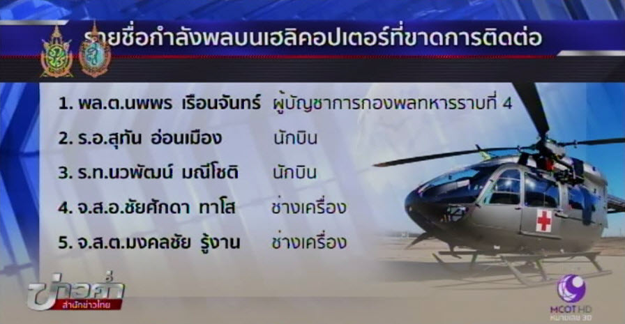 เชียงใหม่ 14 ส.ค. – ผู้บัญชาการทหารบก สั่งตั้งกองบัญชาการค้นหาเฮลิคอปเตอร์คณะของผู้บัญชาการกองพลทหารราบที่ 4 ที่ ขาดการติดต่อ บริเวณอำเภอแม่แจ่มจังหวัดเชียงใหม่ และล่าสุดพบเบาะแสสำคัญ หลังมีชาวบ้านได้ยินเสียงเฮลิคอปเตอร์บินต่ำ แต่ไม่ได้ยินเสียงผิดปกติใด ๆ