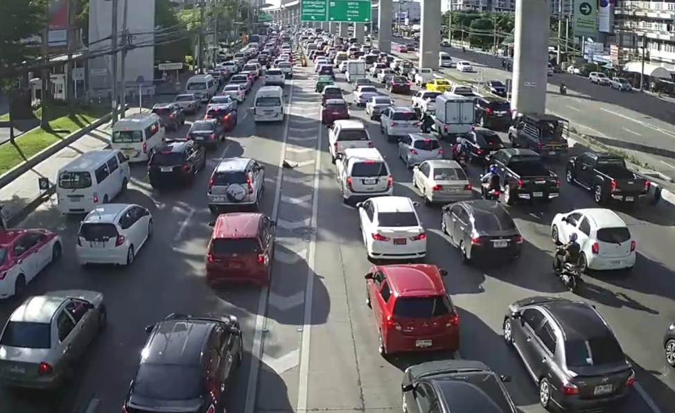ถนนอ่อนนุช ขาเข้า มุ่งหน้าออกไปทางสุขุมวิท รถติดขัดมาก ท้ายแถวสะสมปากซอยอ่อนนุช 76