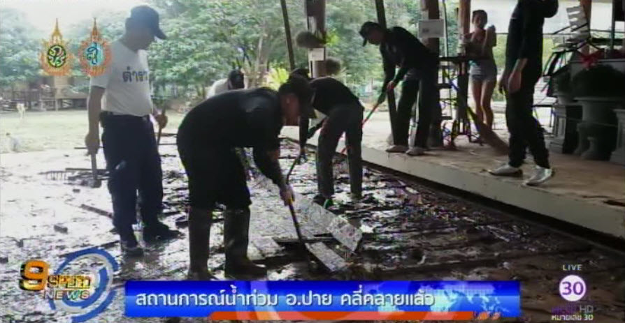 แม่ฮ่องสอน 14 ส.ค. – ทหาร ตำรวจ และเจ้าหน้าที่เทศบาล เข้าช่วยเหลือทำความสะอาด บ้านเรือนประชาชน 6 ตำบล ในอำเภอปาย จังหวัดแม่ฮ่องสอน หลังถูกน้ำท่วมฉับพลันเมื่อวานที่ผ่านมา ขณะที่อำเภอสรุปความเสียหาย ที่เกิดขึ้น พบมีรถยนต์เสียหาย 16 คัน มอร์เตอร์ไซค์ 30 คัน พืชผลทางการเกษตรกว่า 3,500 ไร่ บ้านและเกสต์เฮาส์ 27 แห่ง ฝายกั้นน้ำ 2 แห่ง สะพาน 5 แห่ง ฯลฯ พร้อมสั่งเฝ้ารับมือน้ำท่วมที่อาจเกิดขึ้นตลอด 24 ชั่วโมง. -สำนักข่าวไทย