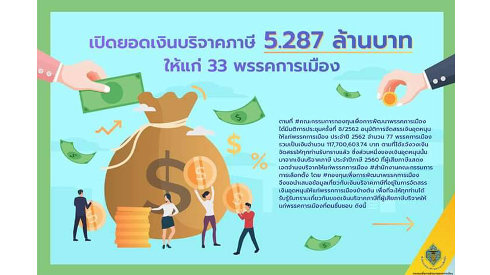 คณะกรรมการการเลือกตั้ง (กกต.) เปิดตัวเลขเงินภาษีที่ผู้เสียภาษีบริจาคให้แก่พรรคการเมืองที่ตนชื่นชอบ จำนวน 5.287 ล้านบาท ดังนี้ 1.ประชาธิปัตย์ ได้รับเงินบริจาคภาษี 4,080,500 บาท 2.ประชากรไทย ได้รับเงินบริจาคภาษี 13,300 บาท 3.มหาชน ได้รับเงินบริจาคภาษี 2,300 บาท 4.ความหวังใหม่ ได้รับเงินบริจาคภาษี 7,900 บาท 5.เครือข่ายชาวนาแห่งประเทศไทย ได้รับเงินบริจาคภาษี 27,700 บาท 6. เพื่อไทย ได้รับเงินบริจาคภาษี 812,100 บาท