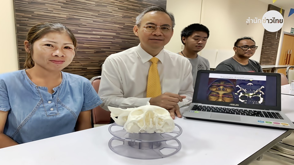 นพ.ธนะสิทธิ์ ก้างกอน ผู้อำนวยการศูนย์แพทยศาสตรศึกษาชั้นคลินิก โรงพยาบาลชลบุรี นำผู้ป่วย 3 รายที่ได้รับการผ่าตัดศัลยกรรมใบหน้ากะโหลกศีรษะและเบ้าตา ด้วยเทคโนโลยี 3D printing มาแสดงให้เห็นถึงตำแหน่งที่กะโหลกศีรษะยุบและเบ้าตาแตกละเอียด ที่ปัจจุบันหายเป็นปกติการมองเห็นภาพซ้อนหายไป และกล่าวว่าเทคโนโลยี 3D Printing เกิดจากการประยุกต์ซอฟต์แวร์ ด้วยการใช้แอพพลิเคชัน เพื่อสร้างภาพธรรมดาให้เป็น 3 มิติ ทดแทนการใช้เครื่องสแกนราคาแพง ผนวกกับ ระบบ 3D Printing หล่อขึ้นรูป โมเดลประยุกต์ฮาร์ดแวร์จากจีนผสมกับยุโรป วางแผนการผ่าตัด ทำให้ได้ขนาดความพอดีของ ชิ้นส่วนกระดูก ไม่ต้องลองผิดลองถูกเหมือนการ ผ่าตัดแบบเดิม
