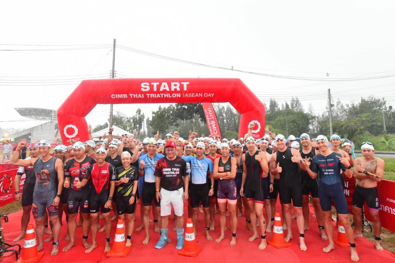 ผู้เข้าแข่งขัน CIMB THAI TRIATHLON FOR ASEAN DAY นำโดยผู้บริหารของกลุ่มซีไอเอ็มบี อาทิ นายอดิศร เสริมชัยวงศ์ รักษาการกรรมการผู้จัดการใหญ่และประธานเจ้าหน้าที่บริหาร ธนาคาร ซีไอเอ็มบี ไทย ผู้เริ่มต้นจากการบุกเบิกโครงการ Exclusive Triathlon Training by CIMB Preferred ให้ลูกค้า CIMB Preferred และได้ก้าวสู่การเป็นนักไตรกีฬาไปพร้อมกัน ลงแข่งรายการ standard