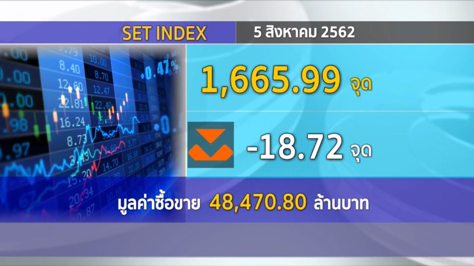 กทม. 5 ส.ค.- ดัชนีตลาดหลักทรัพย์ปิดวันนี้ (5 ส.ค.) ที่ระดับ 1,665.99 จุด ลดลง 18.72 จุด หรือ 1.11% มูลค่าการซื้อขาย 48,470.80 ล้านบาท โดยปรับตัวลงตามตลาดต่างประเทศ จากความกังวลสงครามการค้าระหว่างสหรัฐและจีน ดัชนีเคลื่อนไหวในแดนลบตลอดทั้งวัน ทำระดับสูงสุดที่ 1,681.36 จุด และต่ำสุด 1,664.73 จุด.-สำนักข่าวไทย