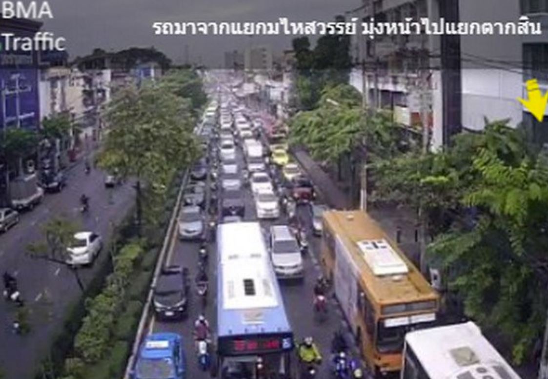 ถนนสมเด็จพระเจ้าตากสิน ขาเข้า มุ่งหน้าแยกตากสิน – วงเวียนใหญ่ รถมาก เคลื่อนช้า สลับหยุดนิ่ง ท้ายแถวสะสมแยกมไหสวรรย์