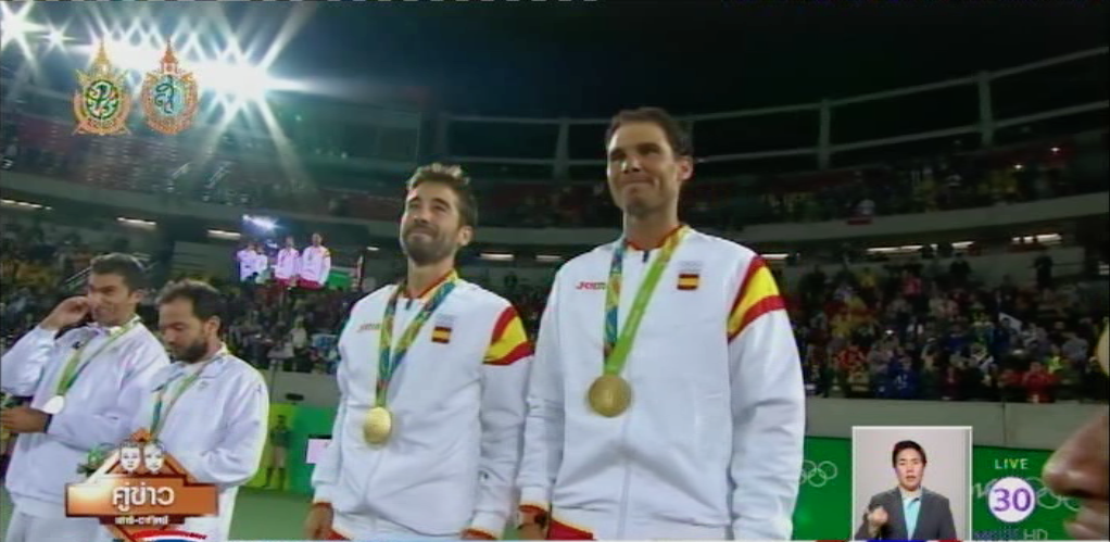 เทนนิสชายคู่ รอบชิงเหรียญทอง ราฟาเอล นาดาล มือ 5 ของโลกจากสเปน ที่ต้องแข่งขันประเภทชายเดี่ยวรอบก่อนรองชนะเลิศจบไปเพียง 1 ชั่วโมงก่อนหน้า จับคู่กับ มาร์ค โลเปซ พบกับ ฟลอลิน เมอร์เกีย กับ โฮเรีย เทเคา คู่อันดับ 10 ของโลก จากโรมาเนีย ซึ่งเกมนี้คู่ของนาดาล กับ โลเปซ เล่นกันได้ดี ชนะไป 2-1 เซต สกอร์ 6-2, 3-6 และ 6-4 โดยใช้เวลาแข่งขัน 2 ชั่วโมง 29 นาที คว้าเหรียญทองแรกให้ทัพนักหวดลูกสักหลาดสเปนได้สำเร็จ และเป็นเหรียญทองประเภทชายคู่ครั้งแรกของนาดาล