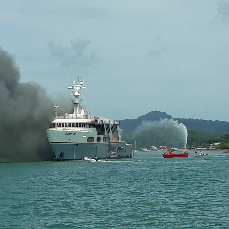 ภูเก็ต 7 ส.ค.-ไฟโหมเรือซูเปอร์ยอร์ชหรูนานนับชั่วโมง ผู้ว่าฯ ภูเก็ตรุดอำนวยการระงับเหตุสั่งลากเรือออกห่างจากท่าอ่าวปอ ท่ามกลางลมแรง จนท.เร่งฉีดน้ำสกัดเต็มที่