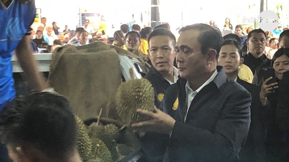 จากนั้น นายกรัฐมนตรี ทักทายประชาชน และตรวจดูทุเรียน ทดลองเป็นพนักงานตรวจทุเรียน ป้ายยา และ เคาะดูเกรดทุเรียน พร้อมบอกว่าที่นี้มีแต่เกรด A และระหว่างการชมทุเรียนสายพันธุ์ยาตงซูซู หรือทุเรียน 300 ปี นายกฯได้ยกทุเรียนขึ้นมาดูและพลาดถูกหนามทุเรียนตำที่มือทำให้เลือดออก ซึ่งนายกรัฐมนตรีบอกว่าไม่เป็นไร แค่นี้ไกลหัวใจ .-สำนักข่าวไทย