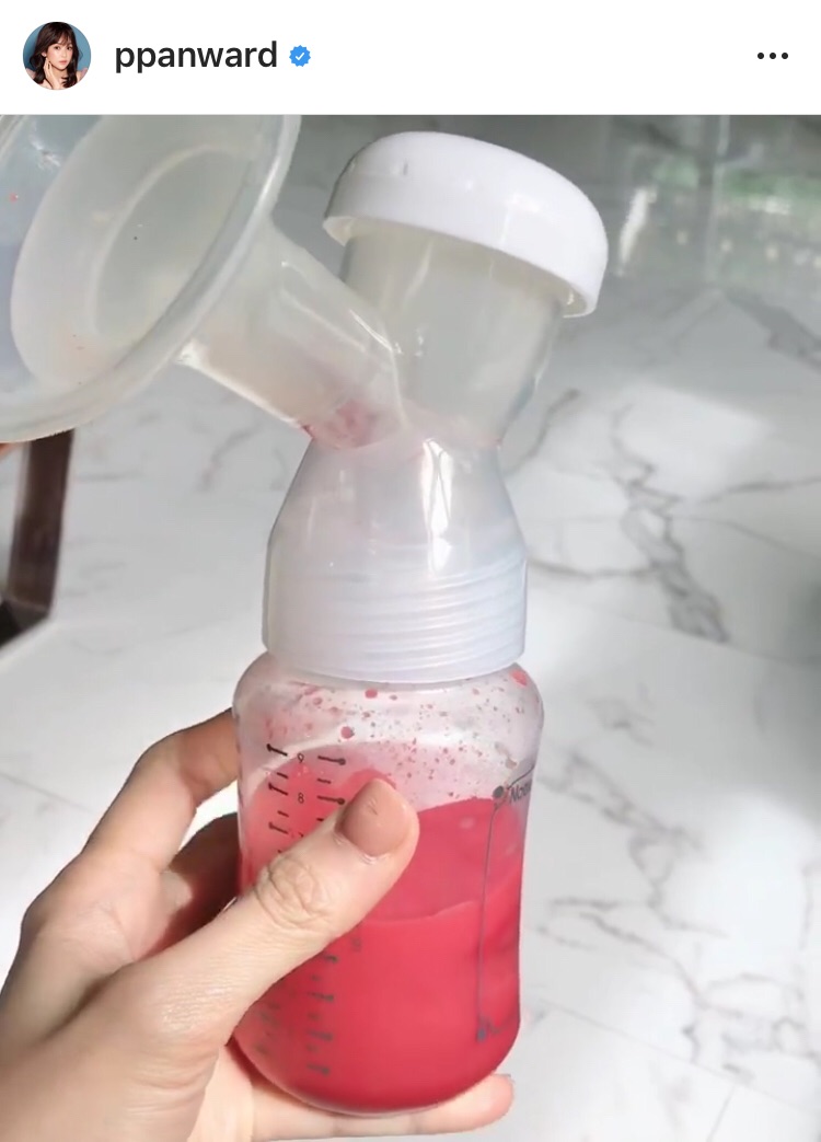 พญ. พิมลพรรณ ต่างวิวัฒน์ หัวหน้ากลุ่มงานอนามัยแม่และเด็ก กรมอนามัย กระทรวงสาธารณสุข กล่าวถึงกรณี ภาพการปั๊มนมแม่ในอินสตาแกรม ของ เป้ย ปานวาด ดาราชื่อดัง ที่มี ก้อนเลือดลักษณะคล้ายเป็นลิ่มปะปนมากับน้ำนม ขณะปั๊มนมให้ลูกสาวคนที่ 2 น้องปราน ปาลิน และน้ำนม มีสีแดงของเลือดปนผสมอยู่นั้น ว่าสาเหตุของเลือดที่ออกมาปนในนมแม่ อาจจะมาจากการปั๊มน้ำแรงเกินไป หรือ เกิดบาดแผลที่บริเวณหัวนม หรือ อาจเกิดการเนื้องอก ที่เต้านม หรือ หัวนมก็เป็นได้ ฉะนั้น ควรได้รับการตรวจ ให้แน่ใจ และไม่ควรนำนมที่มีเลือดผสมอยู่มาให้เด็กดื่ม เนื่องจากได้รับเชื้อโรคบางชนิดที่ติดต่อถ่ายทอดจากแม่สู่ลูก ผ่านน้ำนมได้ เพราะสังเกตเห็นว่า ปริมาณเลือดที่ออกมาที่จำนวนมากอยู่ ขณะเดียวกันลิ่มที่เห็นว่ามีก้อนขนาดใหญ่ ก็เป็นไปได้ว่า มีนมผสมเช่นกัน