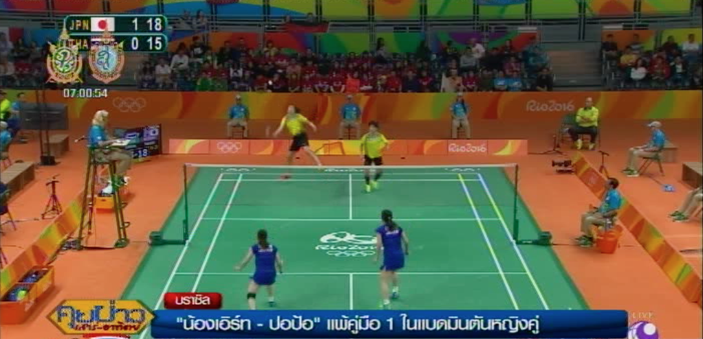 แบดมินตัน ประเภทหญิงคู่ โดย น้องเอิร์ธ พุธิตา สุภจิรกุล กับ ปอป้อ ทรัพย์สิริ แต้รัตนชัย คู่อันดับ 16 ของโลก เจ้าของเหรียญทองซีเกมส์ ปี 2015 ที่พ่ายแพ้ฮอลแลนด์มาในนัดแรกต้องพบศึกหนักเมื่อต้องเจอกับ มิซากิ มัสซุโมโตะ และ อายากะ ทากาฮาชิ คู่มือ 1 ของโลกจากญี่ปุ่น เริ่มเกมแรกนักตบลูกขนไก่สาวจากญี่ปุ่นเป็นฝ่ายคุมเกมและทำคะแนนนำก่อน แต่คู่ของไทยก็ตามมาตีเสมอได้ที่สกอร์ 11 – 11 แต่หลังจากนั้นญี่ปุ่นก็ทำคะแนนหนีนำห่างและเอาชนะไปในเกมแรก 21 – 15 ขณะที่เกมที่ 2 สาวญี่ปุ่นเล่นเกมเร็ว พยายามตบซ้ายขวา ในขณะที่ไทยก็พยายามเก็บทุกลูกแต่ก็ต้านทานไม่อยู่ พ่ายไปอีกด้วยสกอร์เดิมคือ 15 – 21 ทำให้คู่สาวไทยพ่ายแพ้ไป 2 เกมรวด และแพ้ 2 นัดติดต่อกัน โอกาสเข้ารอบริบหรี่ แม้จะเหลือการแข่งขันอีก 1 นัดโดยจะพบกับคู่จากอินเดียในคืนวันที่ 13 สิงหาคมนี้ เวลา 20.45 น.