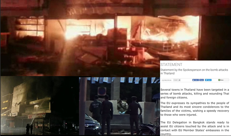 ผู้สื่อข่าวรายงานว่า เฟซบุ๊คของคณะผู้แทนสหภาพยุโรปประจำประเทศไทย เผยแพร่แถลงการณ์โดยโฆษกของนางเฟเดริกา โมเกรินี ผู้แทนระดับสูงของสหภาพยุโรปและรองประธานคณะกรรมาธิการยุโรป เรื่องการโจมตีด้วยระเบิดในประเทศไทยที่เมืองหลายแห่งในประเทศไทยตกเป็นเป้าหมายในการวางระเบิดหลายจุด ทำให้มีประชาชนไทยและนักท่องเที่ยวเสียชีวิตและบาดเจ็บ