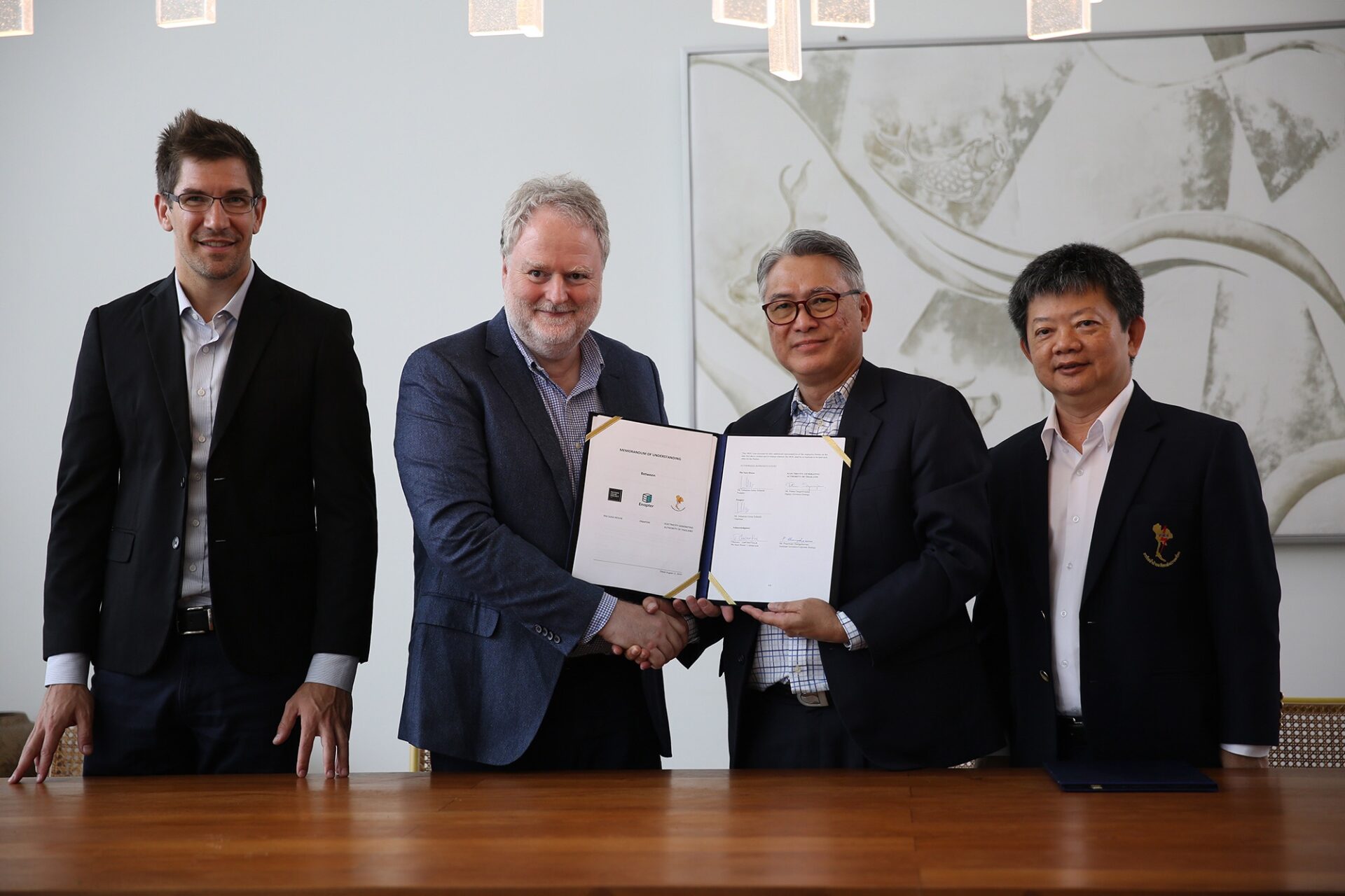 นายพัฒนา แสงศรีโรจน์ รองผู้ว่าการยุทธศาสตร์ การไฟฟ้าฝ่ายผลิตแห่งประเทศไทย (กฟผ.) ร่วมลงนามข้อตกลง (MOU) โครงการ EGAT Energy Excellence Center (EGAT-EEC) ร่วมกับ Mr. Sebastian-Justus Schmidt ประธานกรรมการบริษัท Enapter ผู้ริเริ่มโครงการบ้านผีเสื้อ ซึ่งมีความเชี่ยวชาญด้านการพัฒนาเทคโนโลยีระบบกักเก็บพลังงานในรูปแบบไฮโดรเจน เพื่อร่วมกันพัฒนาระบบโครงข่ายไฟฟ้าอัจฉริยะและไมโครกริด (Smart Grid and Microgrid) ในพื้นที่ศูนย์การเรียนรู้ กฟผ. สำนักงานกลาง เมื่อวันที่ 11 สิงหาคม 2562 ณ บ้านผีเสื้อ ต.สันผีเสื้อ อ.เมือง จ.เชียงใหม่