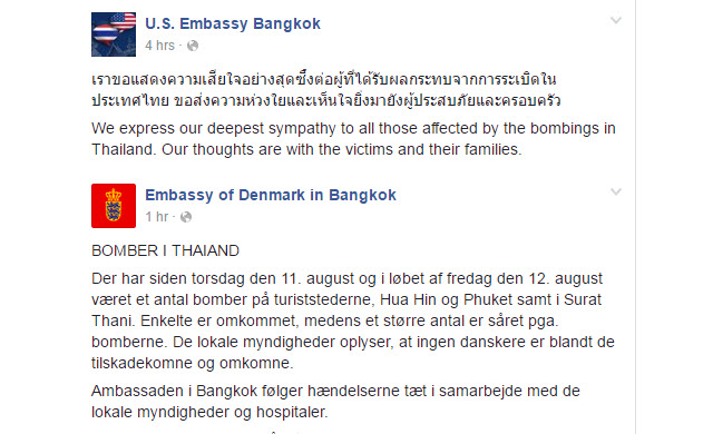 ขณะที่ สถานเอกอัครราชทูตทูตเดนมาร์ก ประจำประเทศไทย โพสเฟซบุ๊คถึงเหตุระเบิดในหลายพื้นที่ทางภาคใต้ของไทย และเตือนให้พลเมืองทุกคนพกพาสปอร์ต เพื่อระบุตัวตนของตนเองไว้ตลอดเวลา และหากเป็นไปได้ ควรมีเอกสารบัตรประกันชีวิตติดไว้ด้วย พร้อมกับเตือนการเดินทางไปยังพื้นที่ที่มีคนพลุกพล่าน และให้ปฏิบัติตามข้อแนะนำของเจ้าหน้าที่ด้วย