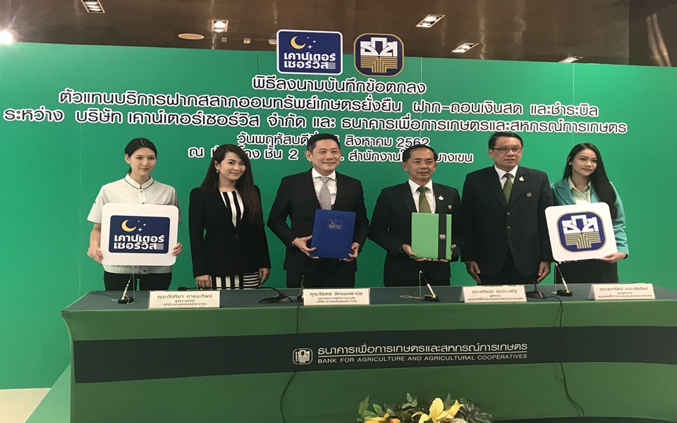 นายอภิรมย์ สุขประเสริฐ ผู้จัดการ ธนาคารเพื่อการเกษตรและสหกรณ์การเกษตร (ธ.ก.ส.) กล่าวว่า ธ.ก.ส. ลงนามในบันทึกข้อตกลงร่วมกับบริษัท เคาน์เตอร์เซอร์วิส จำกัด เพื่อการเป็นตัวแทนของ ธ.ก.ส. หรือ Banking Agent ในการให้บริการรับฝากสลากออมทรัพย์เกษตรยั่งยืน การฝาก-ถอนเงินสด และรับชำระค่าบริการต่าง ๆ ผ่านเคาน์เตอร์เซอร์วิสในร้าน 7-Eleven กว่า 12,500 ร้านค้าทั่วประเทศ เพื่อเพิ่มทางเลือกในการทำธุรกรรมทางการเงินทุกช่วงเวลาที่ต้องการและลดค่าใช้จ่ายในการเดินทางมาติดต่อที่ธนาคาร