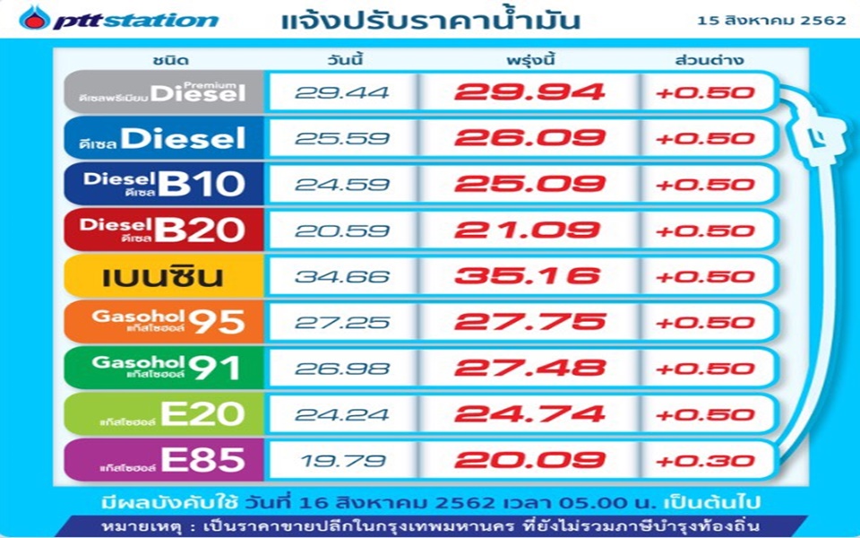 บมจ.ปตท.และ บางจากฯ ปรับราคาขายปลีกน้ำมันทุกชนิดเพิ่มขึ้น 50 สตางค์ต่อลิตร ยกเว้น E85 เพิ่มขึ้น 30 สตางค์ต่อลิตร มีผล 16 สิงหาคม 2562 เวลา 05.00 น. เป็นต้นไป โดยราคาขายปลีกเป็นดังนี้ เบนซิน 95 อยู่ที่ 35.16 บาท แก๊สโซฮอล์ 95 อยู่ที่ 27.75 บาท E20 อยู่ที่ 24.74 บาท แก๊สโซฮอล์ 91 อยู่ที่ 27.48 บาท E85 อยู่ที่ 20.09 บาท ดีเซล 26.09 บาท ดีเซลพรีเมี่ยม 29.94 บาท B10 อยู่ที่ 25.09 บาท B20 อยู่ที่ 21.09 บาทต่อลิตร โดยราคาขายปลีกข้างต้นยังไม่รวมภาษีบำรุงกรุงเทพมหานคร.-สำนักข่าวไทย