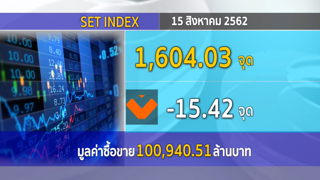 กรุงเทพฯ 15 ส.ค. – ดัชนีหุ้นไทยปิดร่วง 15.42 จุด ที่ระดับ 1,604.03 จุด มูลค่าการซื้อขาย 100,940.51 ล้านบาท กังวลเศรษฐกิจสหรัฐถดถอย.-สำนักข่าวไทย
