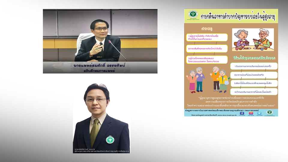 นพ.สมศักดิ์ อรรฆศิลป์ อธิบดีกรมการแพทย์ เปิดเผยว่าการกลืนปัญหาที่พบบ่อยในผู้สูงอายุเมื่อก้าวเข้าสู่วัยสูงอายุระบบการทำงานต่าง ๆ ของร่างกายเลื่อมลง รวมทั้งการเปลี่ยนแปลงที่เกี่ยวข้องกับการกลืนในวัยสูงอายุ ซึ่งเกิดจากความผิดปกติของโครงสร้างและหน้าที่การทำงานของช่องปาก คอหอย กล่องเสียง หลอดอาหาร และกลไกของระบบประสาทที่ควบคุมการกลืน ส่งผลให้ความสามารถในการกลืนของผู้สูงอายุลดลง ทำให้ผู้สูงอายุเกิดภาวะกลืนลำบากยิ่งขึ้น กลไกในการกลืนในผู้สูงอายุแบ่งออกเป็น 3 ระยะ คือ 1.ระยะช่องปาก ผู้สูงอายุไม่มีฟันและกำลังกล้ามเนื้อที่ใช้ในการบดเคี้ยวลดลง ทำให้บดเคี้ยวได้ไม่ละเอียด กำลังและการประสานการทำงานของริมฝีปากและลิ้นลดลง ทำให้กระบวนการเตรียมอาหารและการส่งผ่านอาหารใช้เวลานานขึ้น ต้องมีการกลืนหลายครั้งกว่าอาหารจะหมดจากช่องปาก ร่วมกับผู้สูงอายุบางรายอาจมีอาหารเหลือค้างในปากเป็นแหล่งสะสมของเชื้อก่อโรคเสี่ยงต่อภาวะปอดอักเสบจากการสำลัก