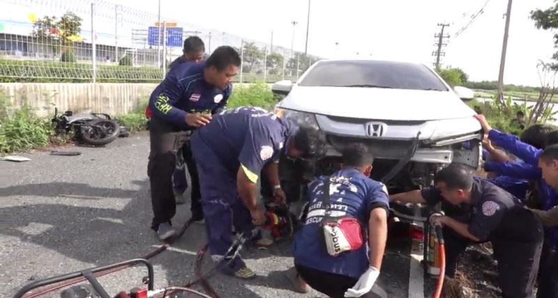 เมื่อเวลา 08.00 น. (16 ส.ค.) พ.ต.ท.บุญสฤษฎิ์ ช่วยชู สารวัตร (สอบสวน) สภ.บางปะกง จ.ฉะเชิงเทรา พร้อมหน่วยกู้ภัยฉะเชิงเทรานำเครื่องมืออุปกรณ์เข้าช่วยเหลือชายวัย 26 ปี คนขับรถจักรยานยนต์ออกจากใต้ท้องรถเก๋ง สีขาว หลังเกิดเหตุบนถนนเลียบมอเตอร์เวย์ กม.2 ฝั่งขาออกเทพรัตน (บางนา-ตราด) กม.39 หมู่ 9 ต.บางวัว อ.บางปะกง เมื่อเจ้าหน้าที่นำตัวชายดังกล่าวออกมาได้พบว่าเสียชีวิตแล้ว