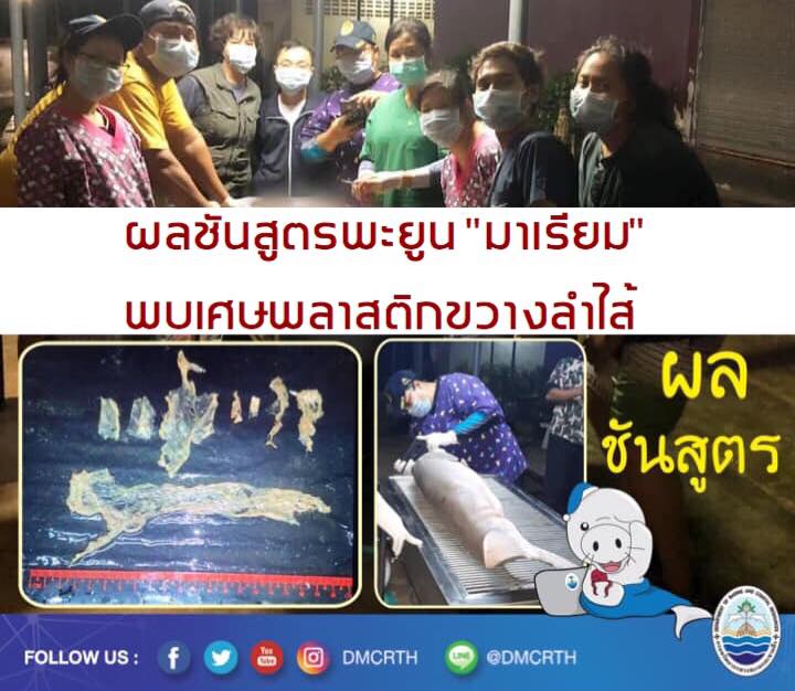 “ไม่อยากเชื่อ น้องมาเรียมจากไปเพราะขยะพลาสติก” วันที่ ๑๗ สิงหาคม ๒๕๖๒ เวลา ๐๕.๕๒ น. ทีมสัตวแพทย์ ๑๐ คน จากกรม ทช. จุฬาฯ กองทัพเรือ และ มทร.ศรีวิชัย ตรัง ร่วมรายงานผลการชันสูตร ผ่าพิสูจน์สาเหตุการตายของน้องมาเรียม สาเหตุมาจากการช็อก นอกจากนี้ยังพบเศษพลาสติกเล็กๆ หลายชิ้นขวางลำไส้ จนมีอาการอุดตันบางส่วนและอักเสบ ทำให้มีแก๊สสะสมอยู่เต็มทางเดินอาหาร มีการติดเชื้อในกระแสเลือด ปอดเป็นหนอง ตามมา