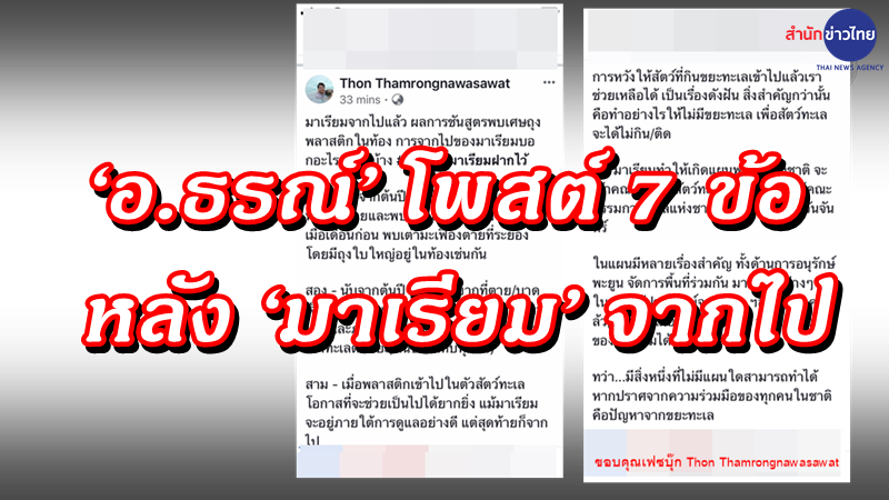 สำนักข่าวไทย 17 ส.ค.-นักวิชาการทางทะเลและสิ่งแวดล้อม โพสต์ 7 ข้อ สิ่งที่ ‘มาเรียม’ ฝากไว้ หลังการจากไป ‘เกิดแผนพะยูนชาติ-กระตุ้นคนไทยตระหนักถึงปัญหาขยะทะเล-ไปให้ถึงมาตรการลดพลาสติกจากต้นทาง’