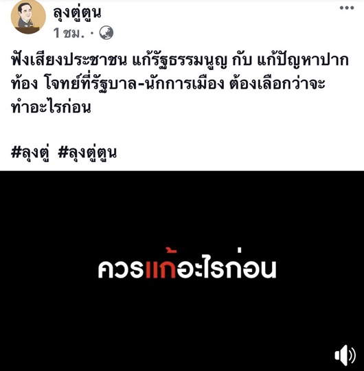 เพจเฟสบุ๊ค ลุงตู่ตูน โพสคลิปวีดีโอ รับฟังเสียงประชาชน แก้รัฐธรรมนูญกับปัญหาปากท้อง โจทย์ที่รัฐบาล นักการเมือง ต้องเลือกว่าจะทำอะไรก่อน