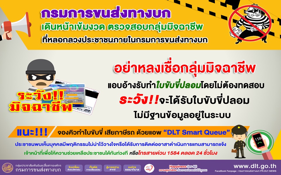 ทั้งนี้ จึงขอแจ้งเตือนประชาชนให้ติดต่อกับเจ้าหน้าที่ผู้ปฏิบัติงานโดยตรงเท่านั้น และอย่าหลงเชื่อกลุ่มมิจฉาชีพที่รับอาสาดำเนินการแทนรับจัดทำเอกสารใบขับขี่ หรือแอบแฝงเข้ามาเร่ขายประกัน พ.ร.บ.ที่อาจประสบปัญหาความคุ้มครองตามกรมธรรม์เมื่อรถเกิดอุบัติเหตุ ทั้งนี้ หากประชาชนพบเห็นบุคคลใดมีพฤติกรรมไม่น่าไว้วางใจหรือได้รับการติดต่ออาสาดำเนินการแทน สามารถแจ้งเจ้าหน้าที่เพื่อให้ความช่วยเหลือประชาชนได้ทันท่วงที หรือโทรสายด่วน 1584 ตลอด 24 ชั่วโมง