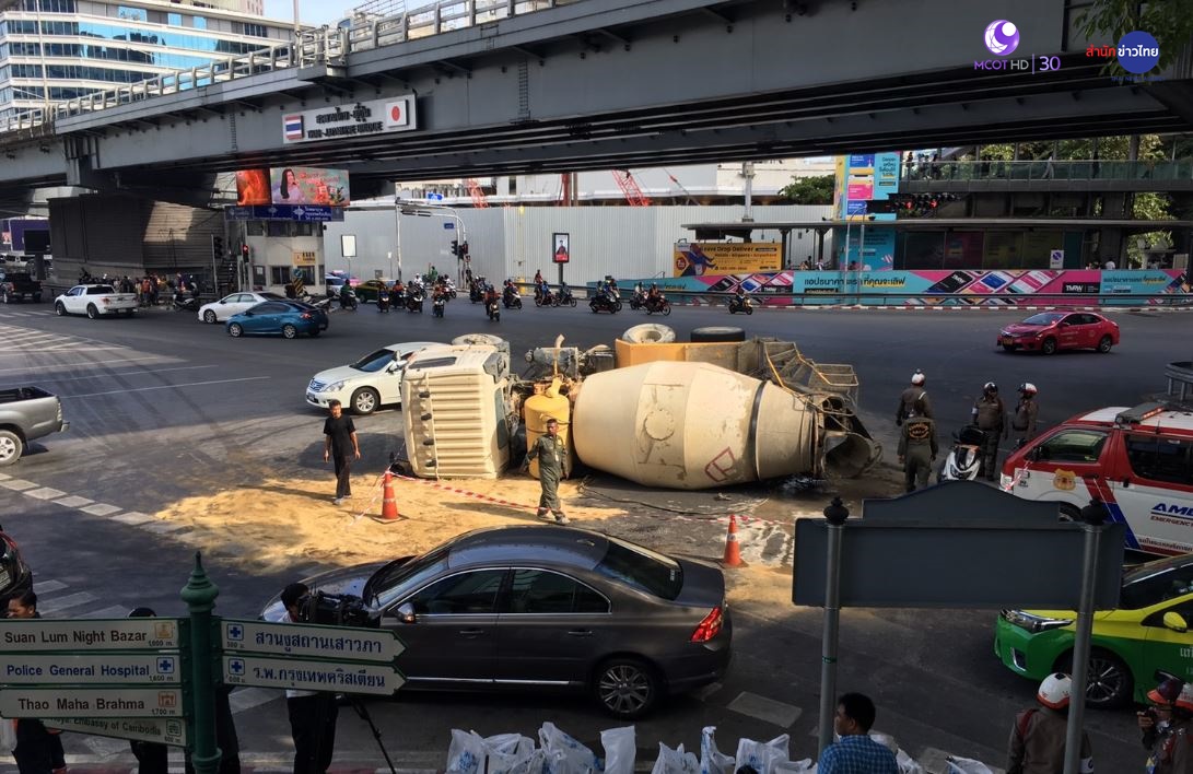 พยานที่เหตุการณ์เล่าว่า รถโม่ปูนคันดังกล่าวแล่นมาตามถนนพระราม 4 ฝั่งขาเข้า เลี้ยวขวาเข้าถนนราชดำริอย่างรวดเร็ว จึงเสียหลักพลิกคว่ำกลางสี่แยก แต่ไม่มีผู้ได้รับบาดเจ็บ ส่วนคนขับรถฉวยโอกาสช่วงชุลมุนหลบหนีไป ขณะนี้ตำรวจให้นายจ้างเร่งติดตามตัวมาสอบปากคำโดยละเอียดต่อไป. – สำนักข่าวไทย