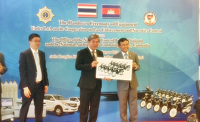 พร้อมมอบวัสดุอุปกรณ์ โดยมีครุภัณฑ์ชุดปฏิบัติการ 10 ชุดประกอบด้วย จักรยานยนต์ 20 คัน ชุดตรวจปัสสาวะ 5,000 ชุด เครื่องมือตรวจพิสูจน์ยาเสพติด 1 เครื่อง รถยนต์กระบะ 2 คัน เรือสำหรับปฏิบัติการตามลำน้ำโขง1 ลำเพื่อสนับสนุนการป้องกันและปราบปรามยาเสพติดให้แก่กัมพูชาด้วย
