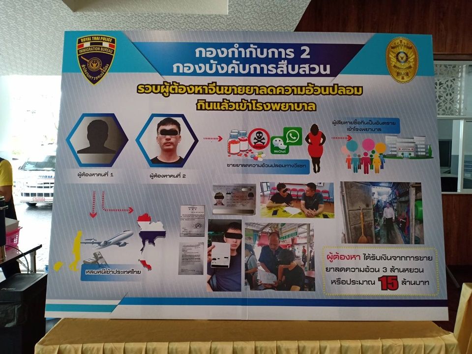 BANGKOK, Aug 22 (TNA) – Thai immigration police arrested a Chinese man, wanted by Chinese authorities for selling toxic slimming pills online, causing damage of about 15 million baht.