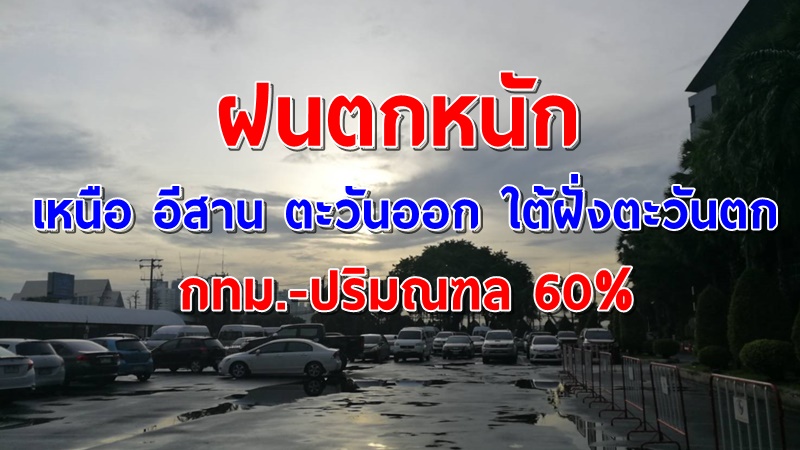 • ภาคตะวันออกเฉียงเหนือ มีเมฆเป็นส่วนมาก กับมีฝนฟ้าคะนองร้อยละ 40 ของพื้นที่ และมีฝนตกหนักบางแห่ง บริเวณจังหวัดเลย อุดรธานี หนองคาย หนองบัวลำภู บึงกาฬ สกลนคร นครพนม มุกดาหาร และอุบลราชธานี อุณหภูมิต่ำสุด 24-25 องศาเซลเซียส อุณหภูมิสูงสุด 30-35 องศาเซลเซียส