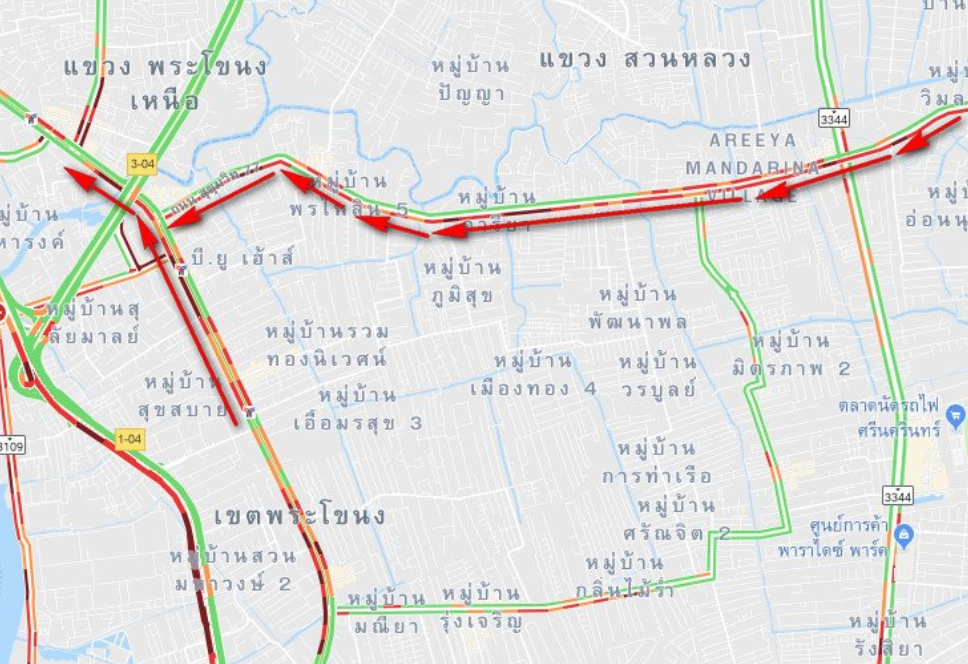 ถนนอ่อนนุช มุ่งหน้าสุขุมวิท รถติดขัดมาก ท้ายแถวยาวต่อเนื่องเลยสะพานข้ามแยกอ่อนนุช พัฒนาการ ส่วนบนสะพานข้ามแยกศรีนครินทร์ รถหนาแน่น