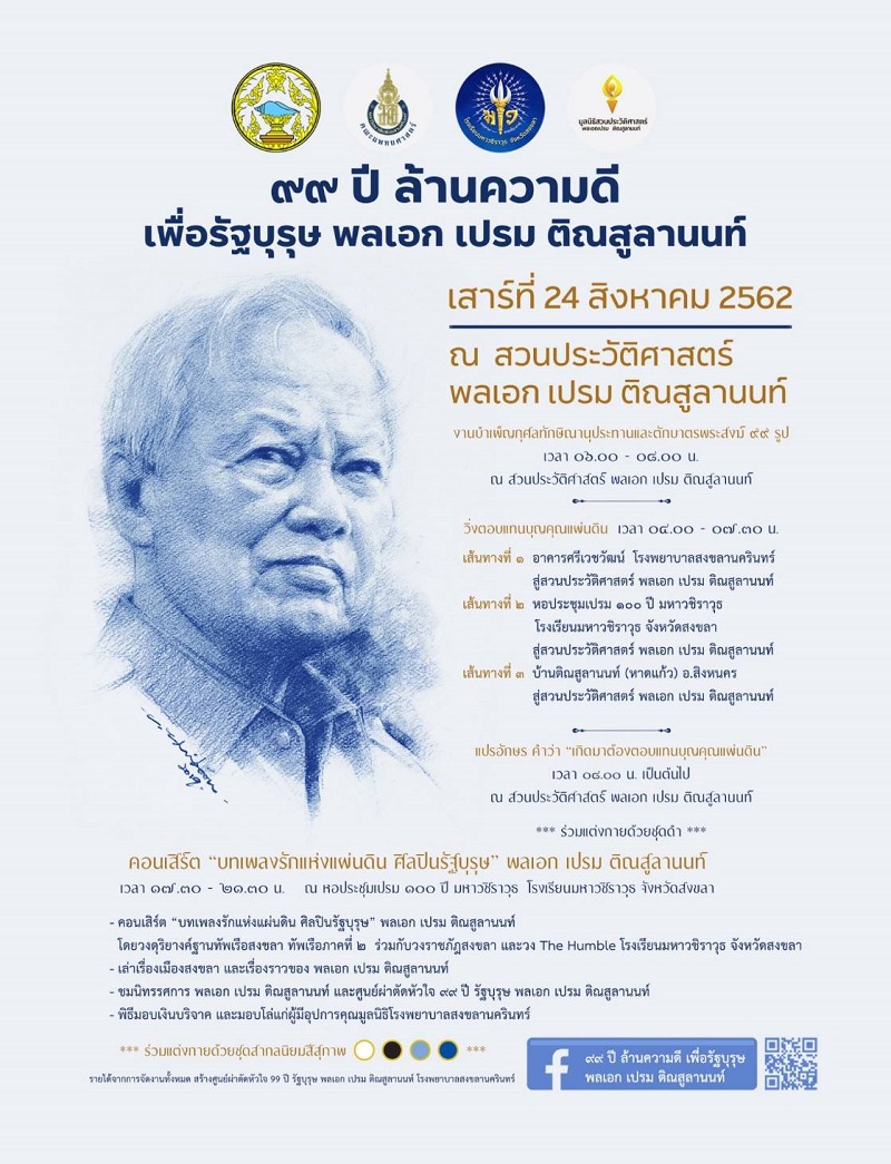 รศ.นพ.พุฒิศักดิ์ พุทธวิบูลย์ คณบดีคณะแพทยศาสตร์ มหาวิทยาลัยสงขลานครินทร์ เปิดเผยว่า ในฐานะคณะแพทยศาสตร์ มหาวิทยาลัยสงขลานครินทร์ เป็นหน่วยงานหนึ่งที่ พล.อ.เปรม ติณสูลานนท์ อดีตประธานองคมนตรีและรัฐบุรุษ มีดำริให้ความช่วยเหลือเกี่ยวกับโครงการจัดสร้างศูนย์ผ่าตัดหัวใจ เพื่อรักษาและช่วยเหลือผู้ป่วยโรคหัวใจใน 14 จังหวัดภาคใต้อย่างยั่งยืน จึงมอบหมายให้ พล.อ.พิศณุ พุทธวงศ์ และ ดร.วิษณุ เครืองาม ช่วยดูแลโครงการนี้ให้ถึงที่สุด พร้อมทั้งอนุญาตให้ใช้ชื่อท่านเป็นชื่อโครงการได้ จึงเป็นที่มาของการจัดโครงการนี้ และใช้ชื่อโครงการว่า “ 99 ปี ล้านความดี เพื่อรัฐบุรุษ พลเอกเปรม ติณสูลานนท์ ” ดังนั้น เพื่อเป็นการระลึกถึงคุณงามความดีและความกรุณาของ พล.อ.เปรม ซึ่งถึงแก่อสัญกรรมเมื่อวันที่ 26 พฤษภาคม 2562 หลายหน่วยงานทั้งภาครัฐและเอกชน รวมถึงมหาวิทยาลัยสงขลานครินทร์ และสถาบันการศึกษาร่วมใจกันจัดกิจกรรมในวันที่ 24 ส.ค.นี้ ซึ่งจะมีพิธีบำเพ็ญกุศลทักษิณานุประทาน และตักบาตรพระสงฆ์ 99 รูป บริเวณหน้าอนุสาวรีย์ พลเอกเปรม ติณสูลานนท์ โดยมี ดร.วิษณุ เครืองาม รองนายกรัฐมนตรี เป็นประธาน