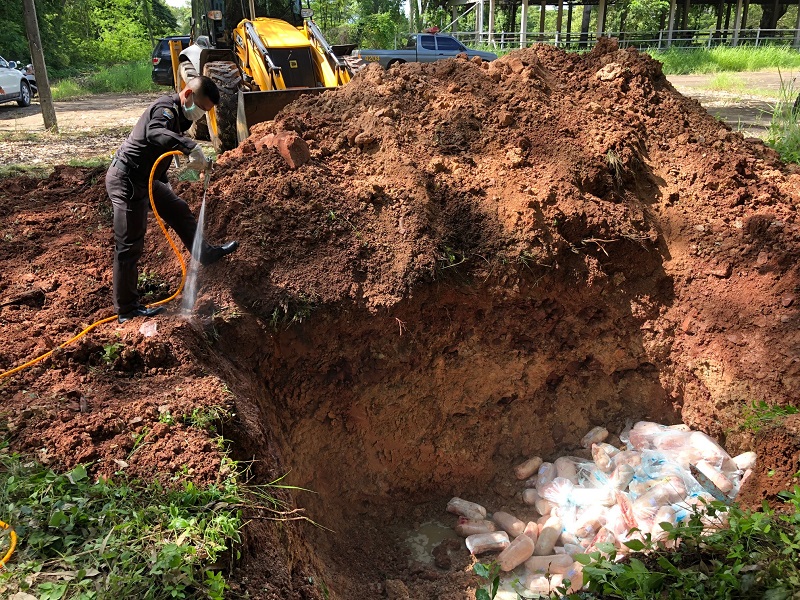 เมื่อเวลา 15.00 น. (23 ส.ค.) ที่ด่านกักกันสัตว์ระหว่างประเทศ อ.เมือง จ.หนองคาย นายสมบัติ ฆ้อนทอง หัวหน้าฝ่ายปราบปราม ด่านศุลกากรหนองคาย นายสันติ ซื่อจริง สารวัตรกรมปศุสัตว์ ด่านกักกันสัตว์หนองคาย พร้อมชุดเจ้าหน้าที่ร่วมกันทำลายสุกรแช่แข็ง หรือหมูกี้ กว่า 200 ตัว โดยขุดดินฝังกลบลึกประมาณ 3 เมตร และฉีดพ่นยาฆ่าเชื้อ ส่วนบรรจุภัณฑ์หีบห่อสุกรแช่แข็ง เจ้าหน้าที่ทำลายด้วยการเผาในเตาเผาขยะ เพื่อเป็นการป้องกันการระบาดของโรคระบาดในสัตว์ โดยเฉพาะโรคอหิวาต์แอฟริกาในสุกรที่มีการระบาดในประเทศเพื่อนบ้านอยู่ในขณะนี้ แม้สุกรดังกล่าวอยู่ระหว่างการส่งตัวอย่างไปตรวจพิสูจน์ว่ามีเชื้อปนเปื้อนหรือไม่ แต่การฝังกลบและเผาทำลายบรรจุภัณฑ์จะสามารถป้องกันโรคได้