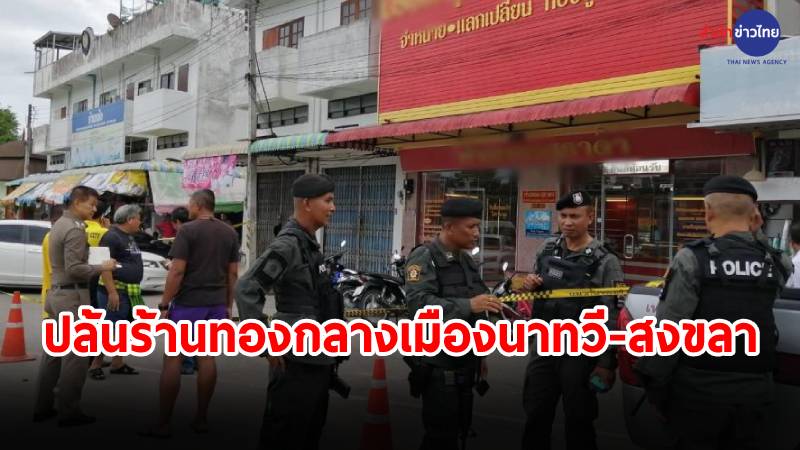 พ.ต.อ.เสกสรร ชูรังสฤษฏ์ รองผู้บังคับการตำรวจภูธรจังหวัดสงขลา พร้อมชุดสืบสวน สภ.นาทวี ลงพื้นที่ตรวจสอบเหตุอุกอาจปล้นร้านทองย่านตลาดเทศบาลตำบลนาทวี เมื่อบ่ายวันนี้ (24 ส.ค.) เบื้องต้นทราบว่าผู้ก่อเหตุ 5 คน แต่งกายลายพรางและอำพรางใบหน้า ลงมาจากรถตู้สีขาวแถบฟ้าเหลืองพร้อมถืออาวุธปืนยาวและปืนพกสั้นตรงเข้ามาประชิดแบบตัวต่อตัวพนักงานในร้าน 3 คน และเจ้าของอีก 1 คน ส่วนผู้ก่อเหตุที่เหลือทำหน้าที่กวาดทองรูปพรรณในร้านแล้วรีบหลบหนีไป