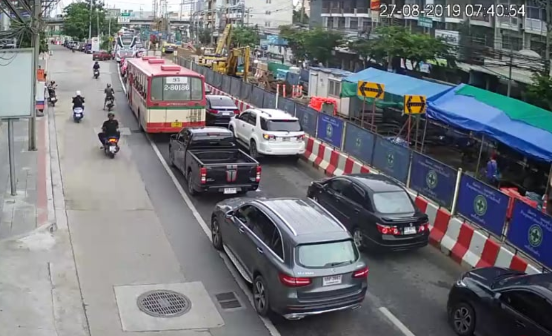ถนนสุขุมวิท ขาเข้า มุ่งหน้าบางนา ต่อเนื่องเข้าแยกพระโขนง รถติดขัดมาก ท้ายแถวสะสมอยู่ที่ตรงข้ามพิพิธภัณฑ์ช้างเอราวัณ
