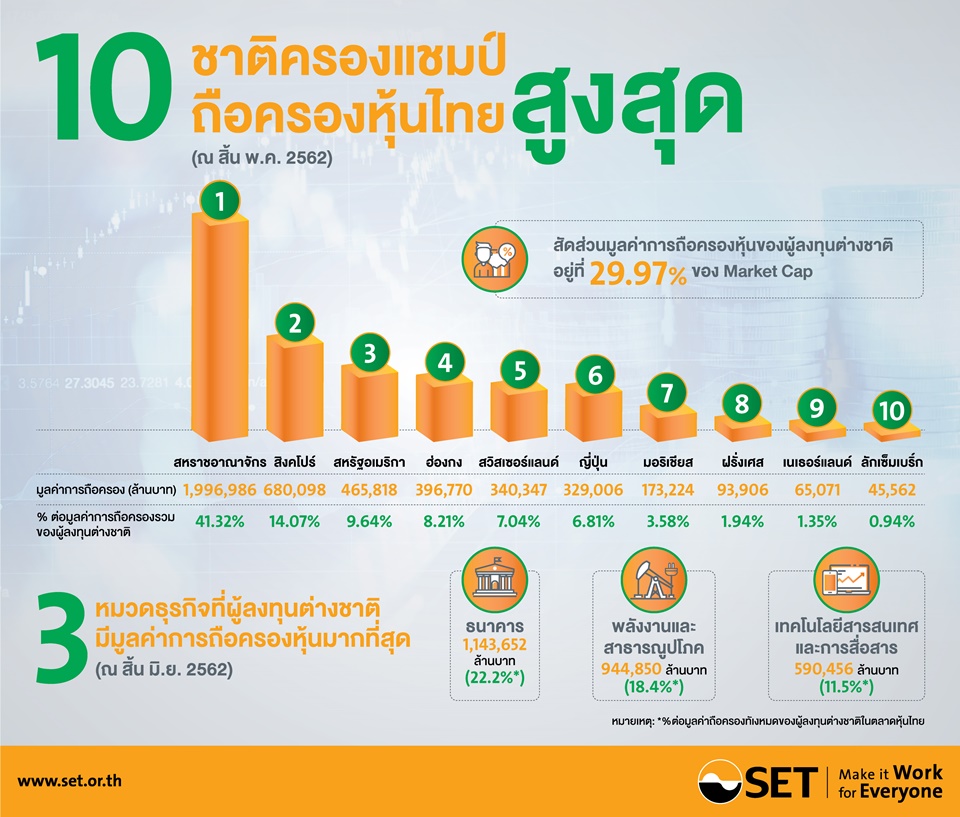 ทั้งนี้ เมื่อพิจารณาการถือครองหุ้นของนักลงทุนต่างประเทศ ณ สิ้นเดือนมิถุนายน 2562 รายหมวดธุรกิจ พบว่า นักลงทุนต่างประเทศถือครองหุ้นทุกหมวดธุรกิจ โดยเฉพาะอย่างยิ่งในหมวดธนาคาร หมวดพลังงานและสาธารณูปโภค และหมวดเทคโนโลยีสารสนเทศและการสื่อสาร ที่มีมูลค่าการถือครองหุ้นรวมสูงกว่าร้อยละ 50 ของมูลค่าการถือครองหุ้นรวมทั้งหมดของนักลงทุนต่างประเทศ และตามมาด้วยหมวดพาณิชย์ หมวดปิโตรเคมีและเคมีภัณฑ์ หมวดพัฒนาอสังหาริมทรัพย์ หมวดอาหารและเครื่องดื่ม และหมวดขนส่งและโลจิสติกส์ ซึ่งหมวดธุรกิจที่กล่าวมาแล้วข้างต้นมีมูลค่าการถือหุ้นมากกว่าร้อยละ 5 ของมูลค่าการถือครองหุ้นรวมนักลงทุนต่างประเทศ
