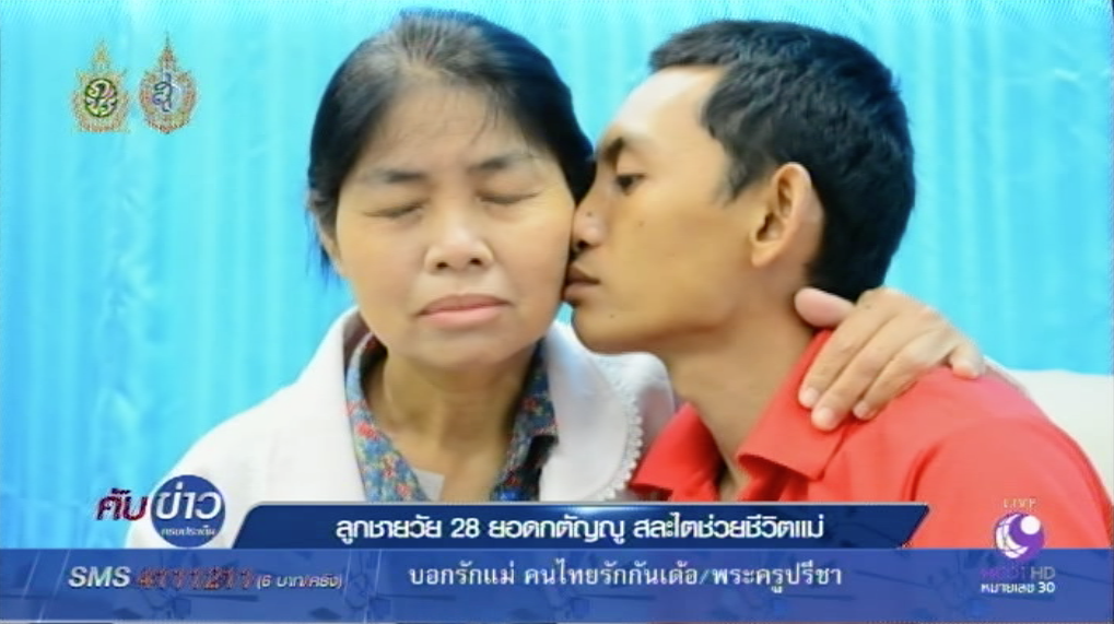 หญิง อายุ 52 ปี ป่วยเป็นโรคไตวายและต้องเข้ารับการฟอกเลือกล้างไตสัปดาห์ละ 3 วัน ที่โรงพยาบาลเชียงรายประชานุเคราะห์ ต้องหลั่งน้ำตาแห่งความยินดีและตื้นตันใจ หลังลูกชายวัย 28 ปี สละไต 1 ข้าง ให้กับผู้เป็นแม่แสดงออกถึงความกตัญญู เพราะแม่ป่วยด้วยโรคไตวายและเริ่มฟอกไตมาเมือเดือนกรกฎาคมที่ผ่านมา และต้องเห็นแม่ต้องมาฟอกเลือดล้างไตแล้วเกิดความสงสาร จึงมอบไตเป็นของขวัญเนื่องในวันแม่ 12 สิงหาคม และจะมีการผ่าตัดปลูกถ่ายไตวันที่ 12 สิงหาคม