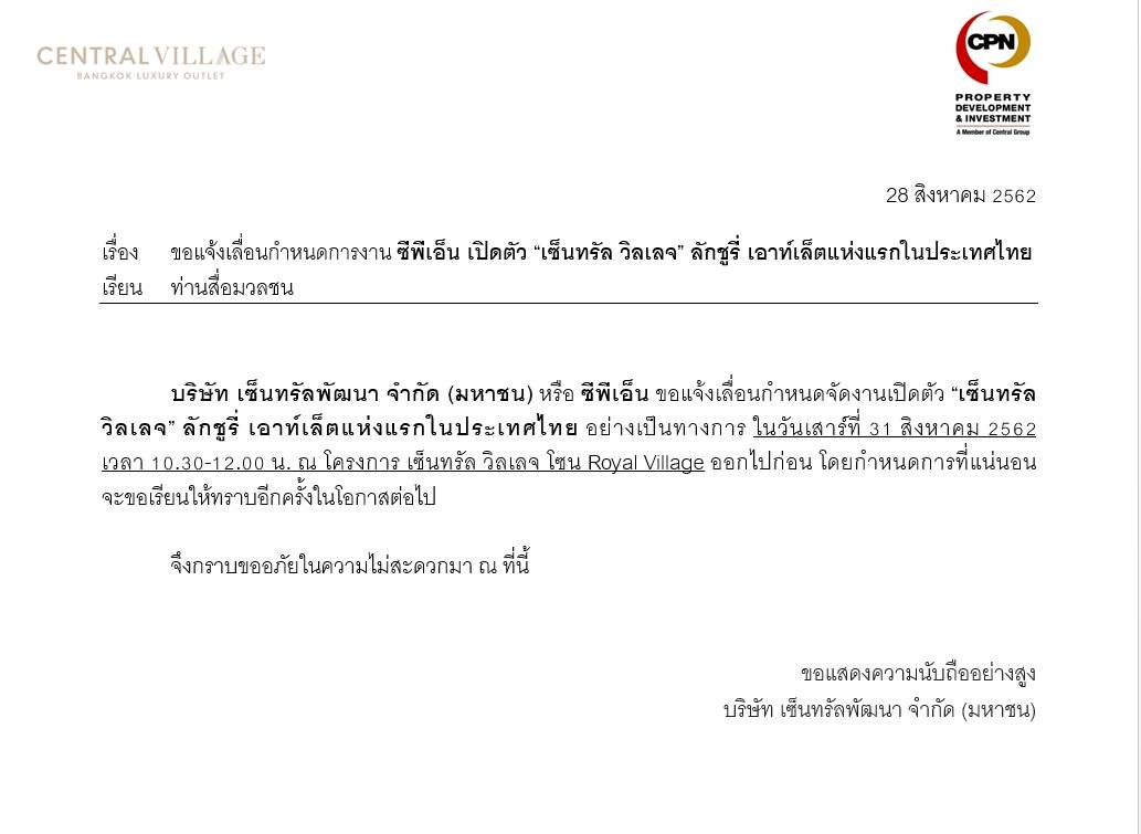 เจ้าหน้าที่ประชาสัมพันธ์ บมจ.เซ็นทรัลพัฒนา (ซีพีเอ็น) ส่งจดหมายแจ้งเลื่อนกำหนดการจัดงานเปิดตัว “เซ็นทรัล วิลเลจ” ลักชูรี่ เอาท์เล็ตแห่งแรกในประเทศไทยอย่างเป็นทางการออกไปก่อน จากกำหนดการเดิมวันเสาร์ที่ 31 สิงหาคม 2562 เวลา 10.30-12.00 น. ณ โครงการเซ็นทรัล วิลเลจ โซน Royal Village โดยกำหนดการที่แน่นอนจะแจ้งให้ทราบอีกครั้งในโอกาสต่อไป