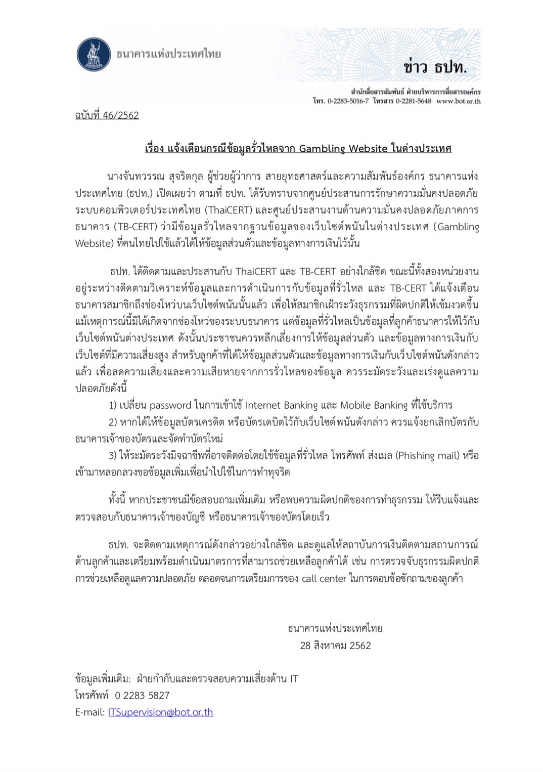 นางจันทวรรณ สุจริตกุล ผู้ช่วยผู้ว่าการ สายยุทธศาสตร์และความสัมพันธ์องค์กร ธนาคารแห่งประเทศไทย (ธปท.) เปิดเผยว่า ตามที่ ธปท. ได้รับทราบจากศูนย์ประสานการรักษาความมั่นคงปลอดภัยระบบคอมพิวเตอร์ประเทศไทย (ThaiCERT) และศูนย์ประสานงานด้านความมั่นคงปลอดภัยภาคการธนาคาร (TB-CERT) ว่า มีข้อมูลรั่วไหลจากฐานข้อมูลของเว็บไซต์พนันในต่างประเทศ (Gambling Website) ที่คนไทยไปใช้แล้วได้ให้ข้อมูลส่วนตัวและข้อมูลทางการเงินไว้นั้น